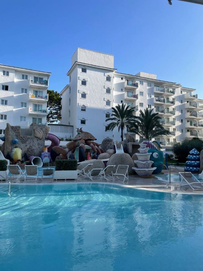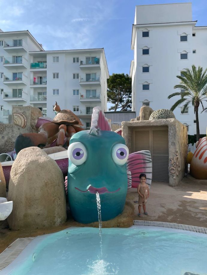 הבריכה ענקית עם אזורים שונים לילדים, יש בה מגלשות ופסלים ענקיים של דגים.