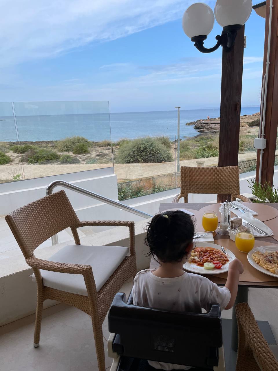 המסעדה מרווחת במיוחד וניתן לשבת בפנים או בחוץ במרפסת המשקיפה לים על שפת הבריכה.